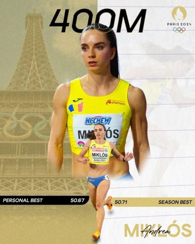 Andrea Miklós este cea mai titrată și promițătoare atletă de pistă din România, specializată în 400 m sprint. Cunoscută pentru viteza și determinarea ei excepționale, Andrea a reprezentat România pe scene naționale și internaționale, inclusiv la trei ediții ale Jocurilor Olimpice.